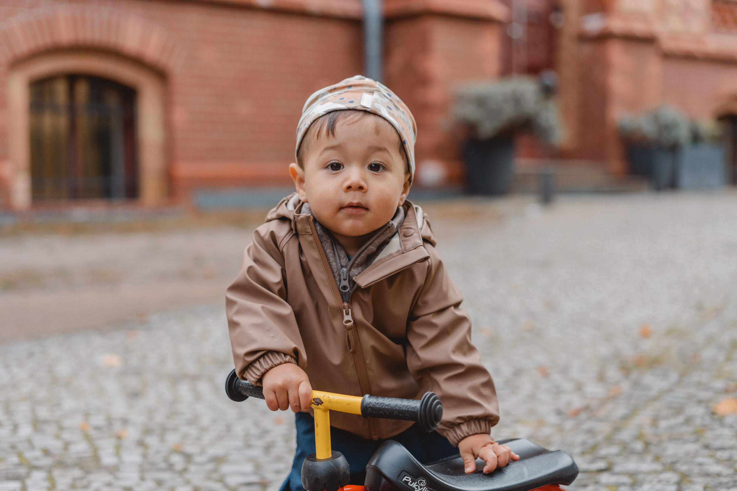 Am besten im Zwiebellook: also mehrere Schichten wie T-Shirt, Pulli oder Strickjacke, Weste, leichte Jacke – so können wir je nach Wetter einfach etwas an- oder ausziehen. In den kühleren Monaten bitte möglichst keinen Schneeanzug – so gemütlich er auch ist: Er schränkt die Kinder oft in der Bewegung ein und verdeckt das halbe Kind. Was die Farben angeht: Gedeckte Töne (wie Creme, Beige, Braun, Khaki oder Grau) wirken auf Fotos besonders schön. Bitte vermeidet auffällige Prints, grelle Farben oder große Schriftzüge – die lenken oft vom kleinen Menschen dahinter ab. Und genau den möchten wir ja in den Mittelpunkt rücken.